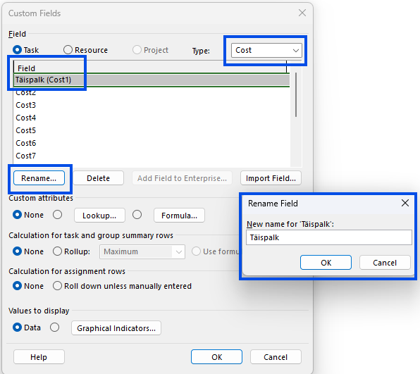 - Vali loendist vaba kohandatud väli, näiteks Cost1.