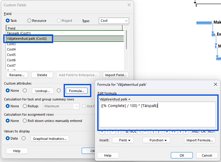 Arvutusväljad aitavad MS Projectis siduda sisestatud andmed automaatsete tulemustega. Kui määrad ühe välja täispalga jaoks ja teise välja valemiga arvutatava tasu jaoks, saad kiiresti näha, kui suur osa palgast vastab tegelikult tehtud töö mahule.