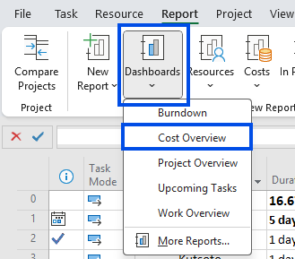 - Ava MS Project ja liigu ülemisel lindimenüül vahekaardile Report.