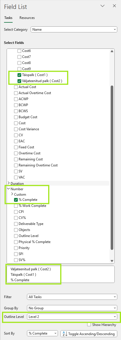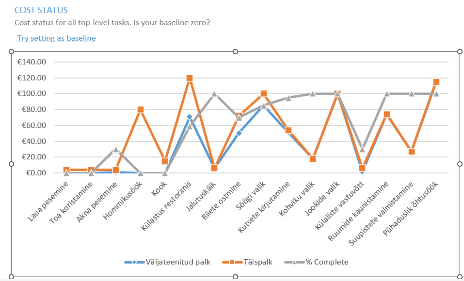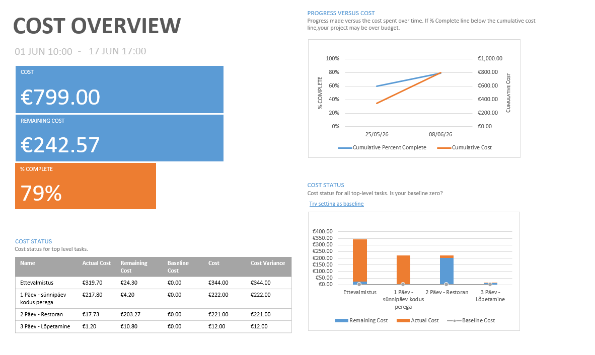 - Kontrolli, kas nähtavad andmed toetavad sinu eesmärki, näiteks kulud, lõpetamise protsent või ajakava seis.